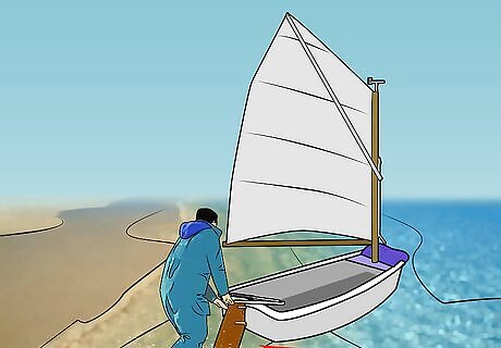 Launch the boat. Slip it into the water and point it towards the wind. While standing on the sea floor or on the dock, clip the rudder in. Line up the bottom pin to its hole first (as this one is longer), making sure the safety catch will prevent the rudder from coming out of the two fittings. Put the daggerboard into its trunk, but do not push it down completely yet. In one movement, push the boat away from the beach or dock and climb in. The wind may be coming from off-shore, cross-shore, or on-shore. In each case there will be directions and places the boat can sail. There are (Go zones) and other zones that the Optimist cannot or should not sail from called (No-Go zones).