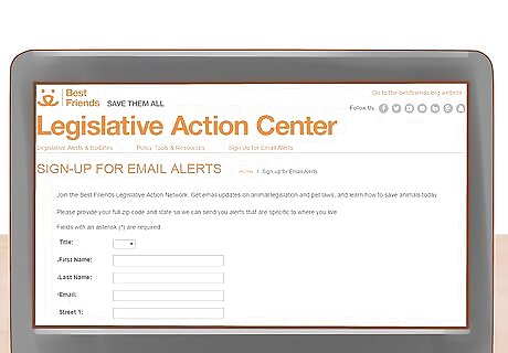 Contact your local legislators to support laws that help dogs. You can learn more about your local laws by reading the news or signing up with an animal right's agency's notification service. This helps you stay informed about what's happening in your area. Then, write, email, call, or visit your elected officials to encourage them to support laws and ordinances that help dogs, such as funding for shelters or laws against cruelty. For example, it’s legal to chain dogs in certain areas, but this is considered to be a cruel practice. If your area allows chaining dogs, you could write your city council and mayor to encourage them to pass a new law banning this practice. Some animal shelters or national organizations allow you to sign up to receive information about issues in your area.