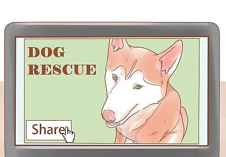 Share social media posts from shelters and rescues. Follow local shelters and rescues on social media sites so you will see all of their posts. Watch for posts about dogs that are available for adoption, supplies the shelter needs, or links to articles about helping pets. When you see a post, hit the share button to post it on your page. For example, some shelters have a featured pet of the week, and you could share that post so more people will see it. Hitting “share” is the easiest way you can save dogs where you live. Additionally, you might create your own pro-shelter or pro-rescue posts to encourage others to support the shelter. For example, you might share a picture of a dog with the tag, “Don’t forget the shelter is constantly in need of dog food, so donate today!”