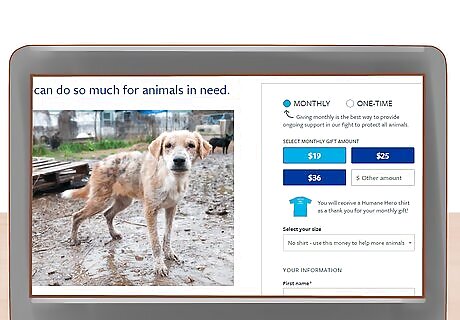 Make a monthly or annual pledge to support the shelter or rescue. Shelters and rescues need money to operate. In addition to buying supplies, they need to pay for costs like housing, air conditioning, staff, and promotional materials. Contact your local shelter or rescue or visit their website to find out how you can give. As an alternative, you might give to a national organization, like the Humane Society or American Society for the Prevention of Cruelty to Animals (ASPCA). In addition to shelters and rescues, you can donate to organizations that provide pet care to low-income families. This can include checkups, as well as spaying and neutering. You don’t need to donate a lot of money to make a difference. Even $5 or $10 can help save dogs in need.Tip: If you can’t afford to make a regular donation, most shelters and rescues will accept a one-time donation.