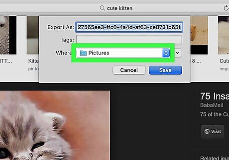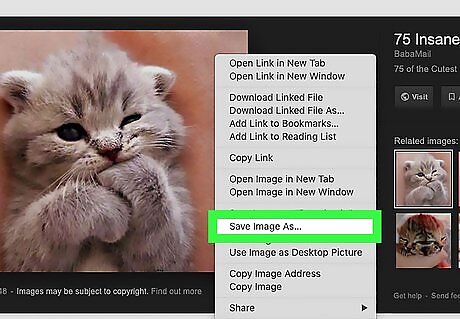 Click Save Image As on the right-click menu. This option will prompt you to select a folder on your computer, and save a copy of the selected image here. In Safari, you can just click Save Image to "Downloads" on the menu, and save the picture to your Downloads folder.