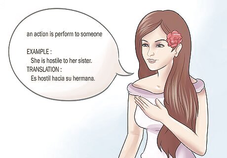 Define a recipient of action with "hacia." If an attitude or action is performed to someone or something, "hacia" can be used. Example: She is hostile to her sister. Translation: Es hostil hacia su hermana.