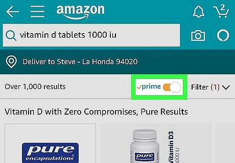 Slide the "Prime" switch to the On Android 7 Switch On position. This switch is near the top-center part of the screen (above the search results). The page will refresh to display only those items that qualify for Prime shipping.