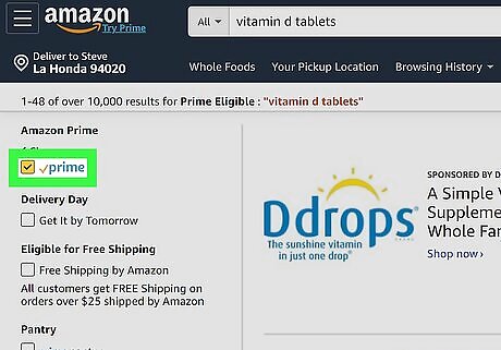 Check the box under "Amazon Prime." It's at the top of the left column beside the yellow-and-blue "Prime" image. The page will refresh to display only those items that qualify for Prime shipping. If you're searching for a grocery item that qualifies for Prime Pantry delivery service, you'll have the option to check the box next to "Prime Pantry" in the left column. If you're looking for clothing or accessories, you may also be able to select "Prime Wardrobe" atop the left column. This option lets you try certain clothing on for free.