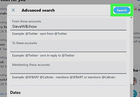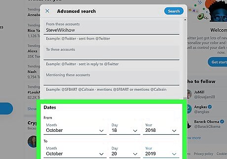 Use the pop-up calendars to select dates for the "From this date" and "to" text fields. Click on the arrows next to the date to scroll through the calendar. You can also click on the year multiple times to change the year specifically. Once you click the year, you can pick the month, then the day. If you need the date you joined Twitter, you'll find it on your profile. You can fill in the fields to specify your search or leave them blank to see all your Tweets.