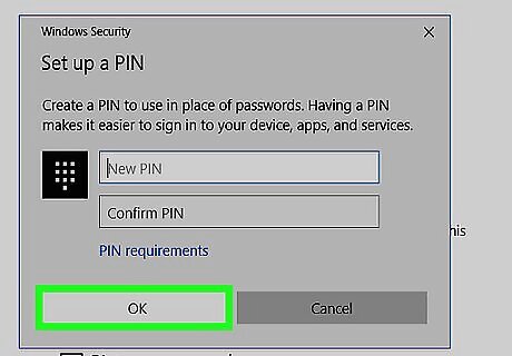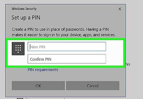 Set the PIN. Enter the desired PIN into the top text box in the new window that just popped up. Confirm it by typing the same exact pin in the "Confirm PIN" text box. Click the "PIN requirements" link to see what your PIN must conform to. Make sure that you choose a PIN that you are going to remember.