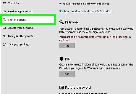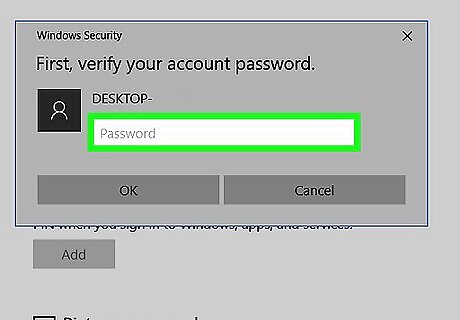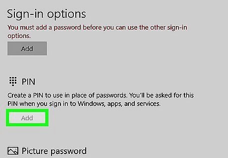 Open the PIN creation window. Click the Add button under the "PIN" header. The window may take a few seconds to open. You'll need to set an account password before using a PIN. This can be done by clicking the Add button under the "Password" header.