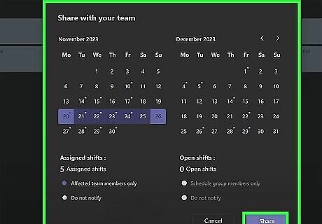 Publish your schedule to the team. Once you’ve created a schedule, you can share it with the whole team to help them track and manage their assigned shifts. Click Share with team at the upper right corner of the schedule, then review the schedule timeframe and details and click Share. You can always make changes to the schedule and share it again!