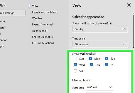 Set your work days, hours, and time zone. The options you see will vary depending on what version of Outlook you’re using and what kind of account you have, but you should see settings for your work days and hours near the top of the menu. Use the boxes to select your work days and the dropdowns to select the start and end times for your work day. In some versions of Outlook, you might see “Meeting hours” or something similar rather than “Work hours” or “Work day starts/ends”. You can also set one or more time zones, which is helpful when you have team members in multiple time zones trying to keep track of when you are available. Depending on your version of Outlook, you may see an option to save your changes, or they may be saved automatically when you close the Settings menu.