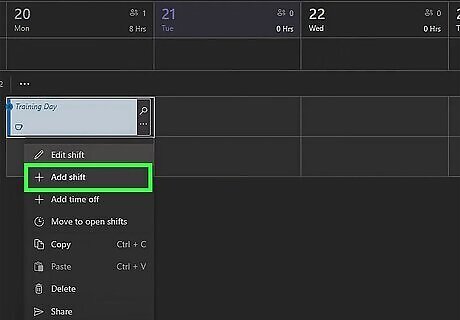 Assign a shift to a team member. Once you’ve set your schedules, you can assign shifts to specific members of each group. To do so: Go to the team member’s row in the schedule, then click More options ••• > Add shift. Fill out the shift information. This includes things like: The shift start and end times. A custom shift name (optional). Unpaid break time (optional). Shift notes. Assigned shift activities. Click Save to save the shift, or click Share to save it and share it with the team member. If you want to add an open shift that team members can request, go to More options ••• > Add open shift, then fill out the shift details. Make sure to include how many slots are available for the shift.