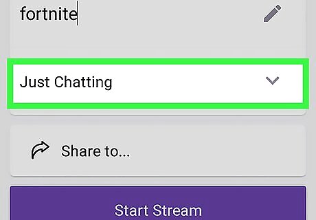 Tap the drop-down menu. You need to select a category to stream in, like Just Chatting or Makers&Crafters.