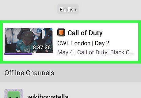 Open Twitch. This app icon looks like a white chat bubble on a purple background. You can find this on either your home screen, in the apps drawer, or by searching. Log in if prompted. A list of categories will load. If not, you can search for a video by tapping on the search icon Android 7 Search at the top left of your screen.