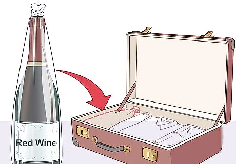 Place your wine bottles in waterproof bags. Wrap the bottles in two layers of clothes. Pack the wine in your suitcase. Make sure to check the suitcase with the wine bottles in at the airport. The average amount of wine you can travel with is 1 litre (4.2 c), about two bottles. For extra protection, wrap bubble wrap around the wine bottles. Double-check your airline's rules and regulations on wine travel.