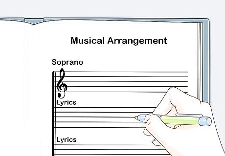 Write out the lyrics and musical factors that make up the arrangement. This includes the solo and all the verses you'll be including in the song. If you're able to read and write music well, write out the notes for the bass as well as any other instruments you're hoping to include in the arrangement. You may need to experiment with several different versions of your arrangement until you discover one you like. If you can't write sheet music, use a computer system to split up the different levels of the song so you can arrange it that way. If you aren't experienced with arranging music, look online for an a cappella arrangement for the song you want to sing.
