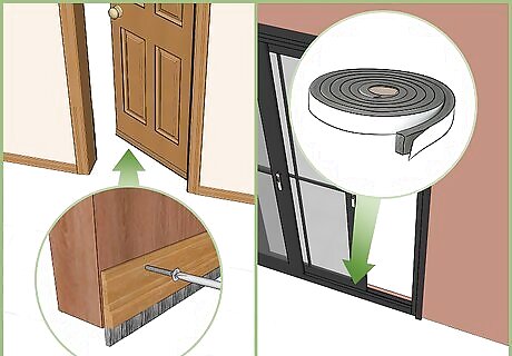 Prevent spiders from entering your home through doors. Make sure spiders can't get through any gaps in your exterior doors. Install door sweeps on all of your exterior doors; spiders can squeeze through an opening that is 1/16” (mm) tall. Use caulk to seal the outside edges of your doors, but use foam weather-stripping to line the bottom track of sliding glass doors.