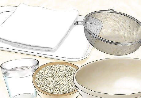 Gather your supplies. For this project you’ll need a fine mesh strainer, 2/3 cup of quinoa seeds, a bowl, water, a tray or plate, cloth, and a sealed glass container or plastic bag.