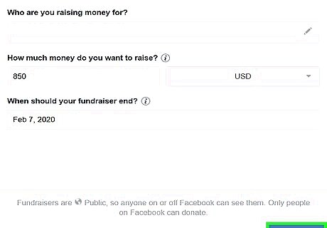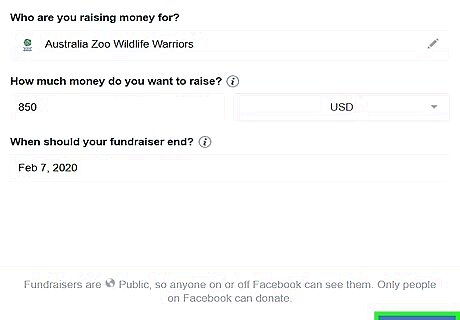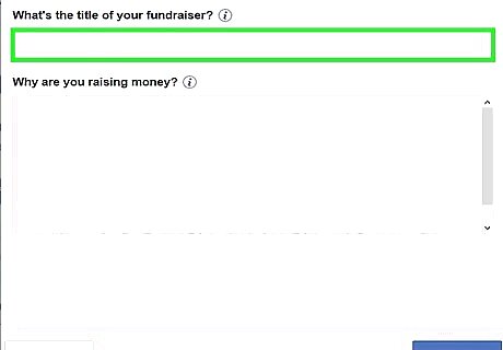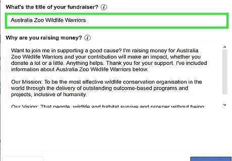 Enter the title and description and click Next. the title and description. Choose a short and clear title to get the attention of your friends so they'll donate. Use the description to write an in-depth, detailed description (minimum of 50 characters) of the fundraiser, such as what the money is benefitting, and why people should donate.