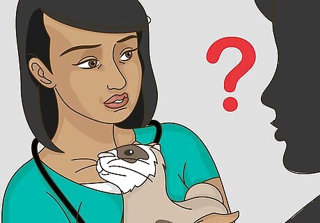 Make an emergency visit to the vet. If you know or suspect your ferret has ingested a toxic plant, it's time to head to the vet. If it's during the day, your regular vet may be able to help, but you should call first. If it's at night, you'll need to visit an emergency vet. Any sign of gastrointestinal distress can indicate your ferret has been poisoned, including vomiting and diarrhea, as well as the presence of blood in either the vomit or the feces. Also, if you see chewed leaves or dug-up dirt, you should call the vet. Tell the vet that you think your ferret has eaten something toxic and describe the plant.