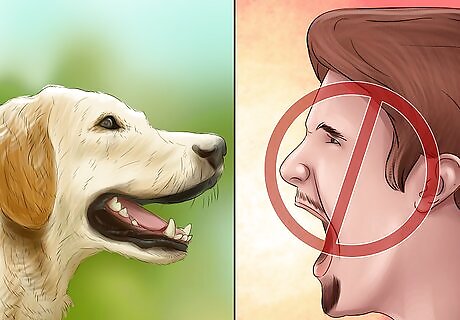 Remain calm while the dog is barking at you. Try not to be visibly stressed, scared, or frustrated with the dog. Acting these ways around the dog can make it bark at you more. Avoid running away from the dog or tensing up your body while it's barking at you. Take a few deep breaths and stay as calm as possible. Do not stare at a barking or anxious dog. The dog may interpret this as an aggressive sign, and it may bite.