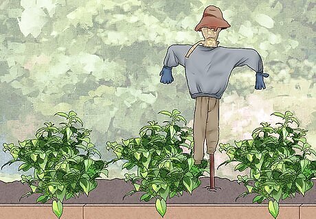 Put a scarecrow or stone statue near your flower beds to spook cats. An old gardener’s trick is to put up a scarecrow or some other type of statue, such as a stone owl. Place the scarecrow or stone statue right next to the flower beds. For an extra measure of protection, you can purchase a special type of scarecrow that has a built-in motion detector. When the cat sets it off, it will shoot a quick burst of water at the cat. Check hardware and garden supply stores for scarecrows and statues that you can place in your garden. Tip: If you don’t mind having something spooky in your yard, you could also purchase a motion-activated Halloween decoration, such as a witch or zombie. Watch for sales after Halloween to get a cheap motion-activated decoration and place it near your flower beds.