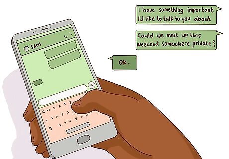Ask the person to meet you somewhere private so you can talk. Avoid crowded, loud, public places, as they could make you feel more self-conscious and inhibit your conversation. Your home, an empty classroom, or a quiet coffee shop are good options that should give you a bit more privacy. Ask in person or feel free to send a text or email. Say something like, “I have something important I’d like to talk to you about. Could we meet up this weekend somewhere private?” This can often be the hardest part of the conversation! Getting the ball rolling puts you in a position where it’d be really hard to back out of having the talk.Tip: If you have a lot of nervous energy, ask to go for a walk with your confidant of choice. This will give you a physical outlet for your energy while still allowing you some privacy for your conversation.