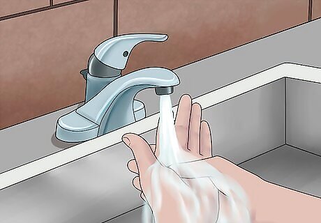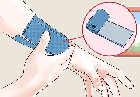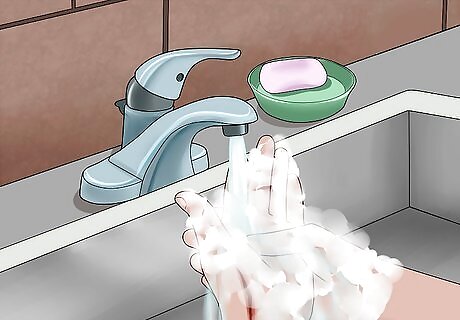 Wash your hands. Before working on someone, it's important to wash your hands if possible. That way, you won't introduce infection to the wound. Also, put on medical gloves if they are available. Gloves will protect both you and the person you're caring for from bloodborne illnesses including HIV and viral hepatitis. If gloves are not available, substitute plastic bags or some other impermeable material. You can also use many layers of clean cloth or another clean material. In this case, instead of putting pressure on the wound yourself, ask the injured person to to do so. Only use your bare hands if it is a serious, dire medical emergency. Don't risk your health! Wash your hands for at least 20 seconds in warm water with soap. Scrub them thoroughly. If soap and water are not available, an alcohol-based sanitizer can be used instead.