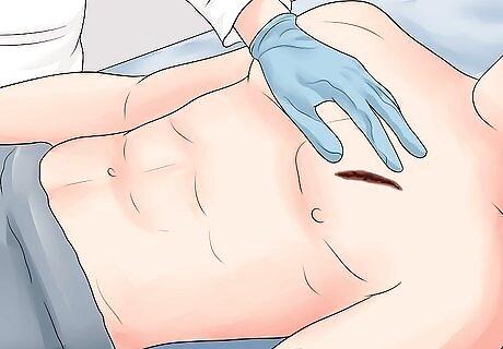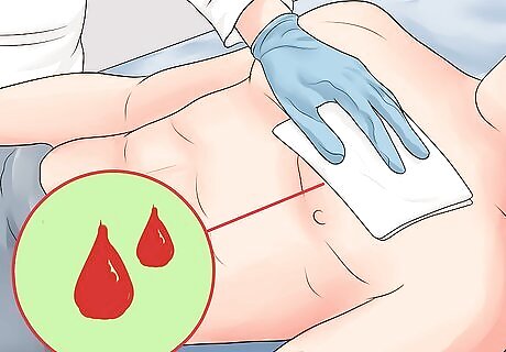 Look to see if it has stopped bleeding. A minor cut by definition should stop bleeding on its own fairly quickly. The body's response is to clot the wound, and with a small cut, it should stop bleeding fairly quickly. Often abdominal and chest wounds are more serious than they look. You should always have these checked out by a professional. Mild bleeding can be a serious situation if the person is on a blood thinner, or it is a puncture wound. Mild bleeding should only affect the top layers of the skin. You should not be able to see organs underneath, for instance, and the wound should not be gushing or have a pulsating flow — these things indicate a medical emergency and you should call 991 immediately. Mild cuts should "ooze," meaning bleed slowly.