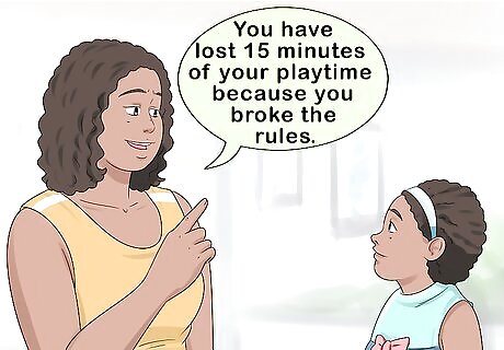 Enforce rules rather than repeating them again and again. Communicate the rules in your household clearly so that your children understand what they are meant to do. Then, if they break the rules, don’t repeat the rules over and over again. Start applying consequences instead. For example, don’t say, “No running in the house!” over and over again. Say it once or direct your children to the household rules chart. Then, if they continue running in the house, you might say, “I asked you not to run in the house, Jessica. You have lost 15 minutes of your playtime because you broke the rules.”