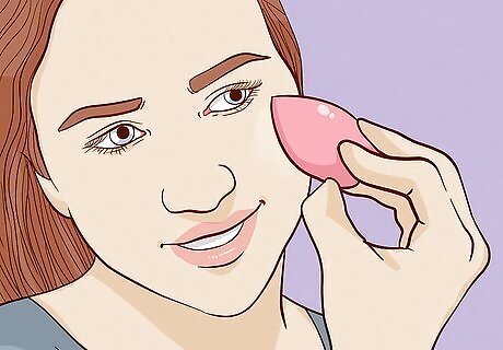 Use a sponge to blot out excess product. Once your foundation is mostly blended, take a makeup sponge. Gently dab the sponge over the places on your face where you applied foundation. The sponge should lift any excess product off your face, preventing a cakey look.