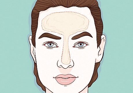 Apply your foundation to the T-zone. You don't need to apply foundation all over your face. Focus on what's called your "t-zone." This is the central part of your face concentrated in your forehead, nose, and chin. Use your brush or sponge to blot dots of foundation up the bridge of your nose, on your forehead over your eyebrows, on your cheeks, under your nose, and on your temples. When placing foundation on your cheeks, do about three diagonal strips across each cheek.