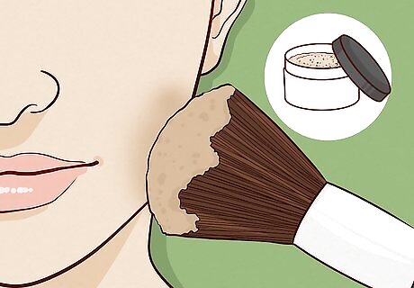 Finish with a setting powder. You can buy a setting powder at any beauty supply store. Applying it after applying foundation helps give your skin a clear, even tone. Use a large brush to swipe your setting powder throughout your face for a clean finish. If you notice uneven or excess foundation you missed earlier, you can wipe this off with your large brush while applying your setting powder.