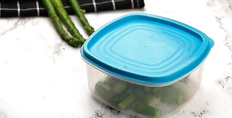 Store the asparagus in an airtight container. Cooked asparagus will last the longest if you store it in a container with as little air as possible. A plastic or glass food storage container with a tight-fitting lid is best.