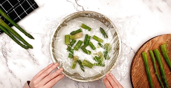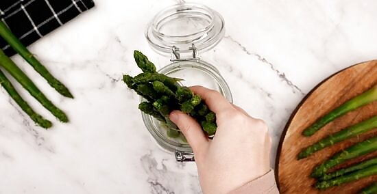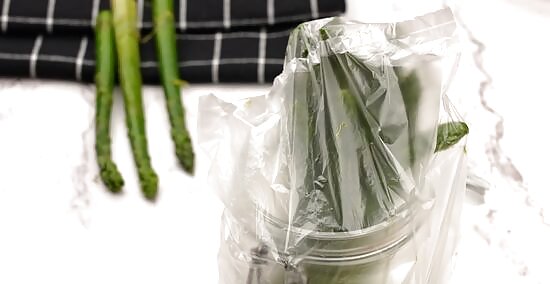 Cover with a plastic bag. Use a loose plastic bag (the type used for produce at the grocery store) and drape it over the asparagus tips and jar. This will keep the asparagus tasting fresh; without the bag, the stalks will take on the flavor of whatever else you're keeping in your refrigerator.