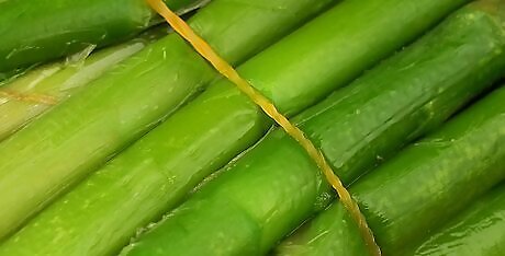 Leave the rubber band around the bunch. Asparagus usually come bunched and tied with a rubber band. The band makes it more convenient to store the asparagus upright and preserve freshness, so leave it in place until you're ready to cook your asparagus.