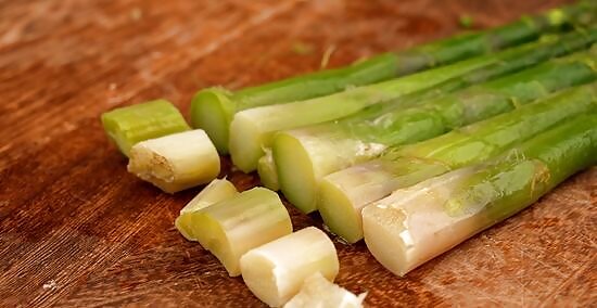 Chop the asparagus into one-inch pieces. In order for the asparagus to blanch evenly, it's best to chop it into smaller pieces. If you'd prefer to leave the stalks intact, that's fine, but the flavor may be compromised.