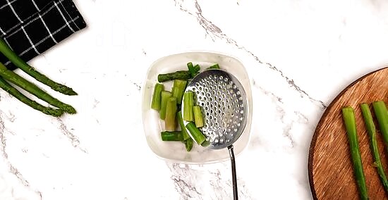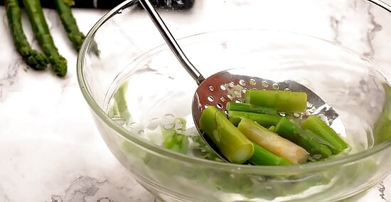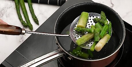 Transfer the asparagus to the ice bath. Use a slotted spoon to immediately transfer it to the ice bath so it can cool down and stop cooking. Leave it in the ice bath for the same amount of time you boiled it, then transfer it to a colander to let it drain and dry.