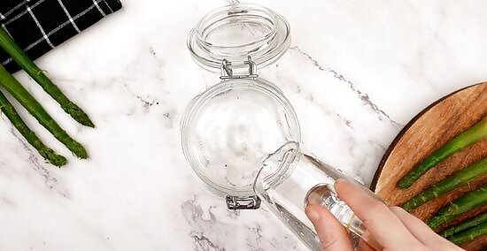 Fill a bag or jar with an inch of water. A glass mason jar is usually just the right size for a bunch of asparagus. An empty jelly jar or pickle jar also works well. If you're trying to save space in your refrigerator, go with a sturdy plastic storage bag. Fill your storage container with an inch or so of water, enough to submerge the ends of the asparagus. There's no need to fill the container all the way to the top; you just enough water to keep the asparagus moist. Another convenient method is to dampen a paper towel and wrap it around the cut ends of the asparagus. You'll need to change the paper towel every few days as it dries out.