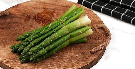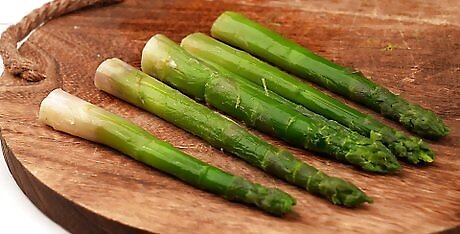 Choose the freshest possible asparagus. Fresh asparagus should be bright green and firm from the tips all the way down the stalks. Check the bottom of the stalks: if they're tough and brown, that means the asparagus was not freshly cut. Avoid asparagus with discoloration or brown spots. Don't choose asparagus that feels as though it's going limp.