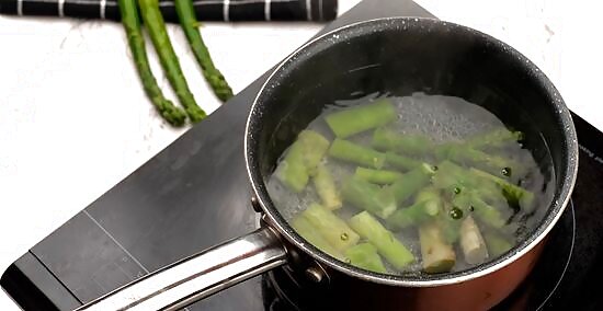 Boil the asparagus for one minute. If your spears are extra-thick, boil them for longer; if they're thin, boil them for just thirty seconds. Monitor the asparagus carefully so you don't end up overcooking it.