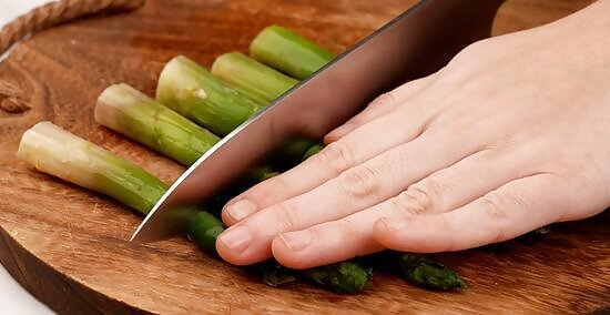 Trim the ends if necessary. When you bring your asparagus home, you may need to trim half an inch or so from the ends of the stalks. Take a sharp knife and trim off the part that's a little tough and woody. Discard the cut ends.