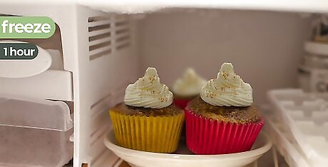 Freeze the cupcakes for 1 hour if you've already frosted them. Leave your cupcakes uncovered and on a plate. This is a pre-freeze that will harden the frosting. They're ready to be taken out of the freezer when the frosting does not warp when you gently touch the surface. If you don't have enough space in your freezer for all of your cupcakes to sit on a plate to pre-freeze, you may need to do multiple rounds of pre-freezing.