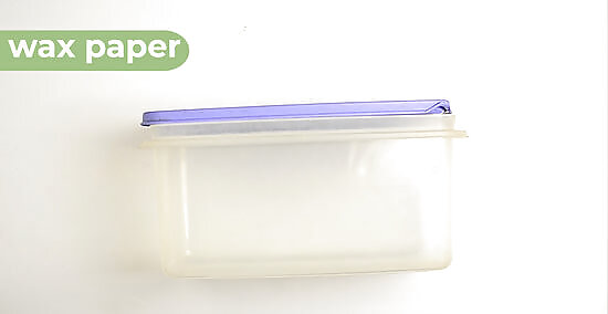 Lay a sheet of wax paper on the bottom of the container. Cut it if you need to make it the right size to fit in your container. Wax paper is great because it has a thin layer of wax over it that stops food from sticking to it. If you don't have wax paper, parchment paper is a good substitute.