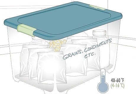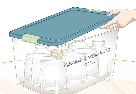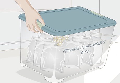Keep food in clearly labeled plastic bins for extra protection. Although jars, cans, and mylar bags can keep foods fairly safe from pests, adding them into a plastic container with a lid will add another layer of protection. Label bins with what they contain and when you packaged the foods so that you will know when to check the food for freshness. Foods that you store in soft containers, such as mylar bags or plastic bags should be a high priority for bin storage since rodents can chew through them.