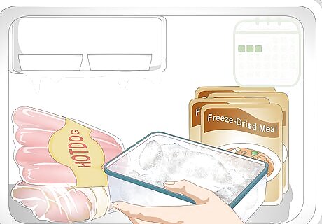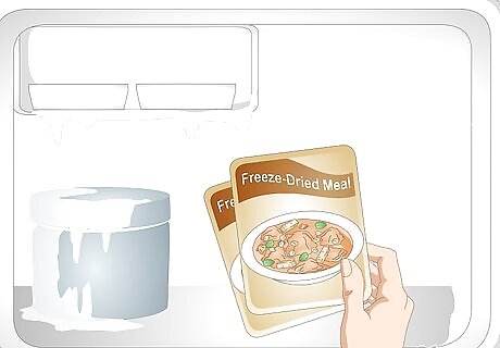 Keep freeze-dried meals on hand for short-term emergencies. Having a few freeze-dried meals on hand can help in the case of a short-term emergency that lasts for a few days. However, its usually a more efficient use of money and space to store ingredients for a long-term emergency. You can buy freeze-dried meals from camping and army supply stores. Some freeze-dried meals can last as long as 20 years. A freeze dried meal can cost anywhere from $3-8 per serving. These meals often need water to rehydrate them and make them edible, so consider storing bottled water alongside them.
