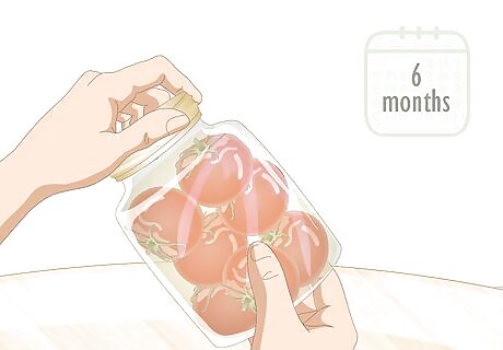 Pickle vegetables to store them for up to 6 months. Add vegetables such as cucumber, tomatoes, green beans, carrots, and radishes into cans with a 50% water, 50% white vinegar solution. Add in salt, pepper, and dried or fresh herbs to your taste. If there are air bubbles in your pickling brine, throw out the pickles. This means that air and bacteria got into the can.