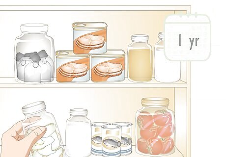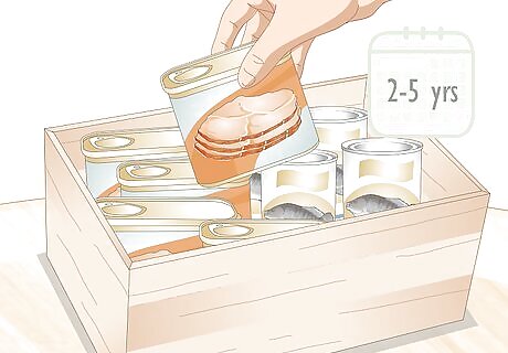 Stock canned foods for 2-5 years. Canned tuna and meats can provide essential protein in an emergency situation and last several years. Canned fruits and vegetables will also last up to 5 years and are rich in vitamins and minerals. Good choices for canned fruits and vegetables include canned tomatoes, pumpkin, whole preserved fruits, and pickles. Canned fruits will be most flavorful if eaten within a year, but can last for 2 years. Check for discoloration or a rancid smell before eating them.