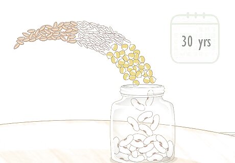 Store foods with less than 10% moisture and low oil for up to 30 years. Oil and moisture can cause food to go rancid and make you sick. Foods that you can reliably store for decades include dried or dehydrated foods sealed in airtight containers. Examples of the longest-lasting foods include wheat, corn, beans, rice, sugar, oats, flour, pasta, and powdered milk.