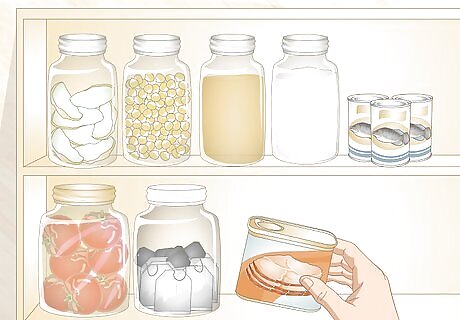 Stack your stored food on shelves. Shelving will allow you to more effectively organize and monitor your stored food. Wooden or wire shelving will be sturdy and long-lasting. Look for shelving to go on sale around August for back-to-school season and January around the new year. Also consider building your own shelves if you have the materials and skills.