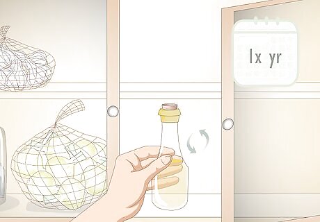 Check your stored food for spoilage at least once a year. Take stock of your storage around once a year so that you know exactly what you have available and what you could replenish. Throw out any cans that are bulging, as this can be a sign that air and bacteria have gotten in. Toss any food that is moldy or smells rancid. Eat any foods that are close to expiring and replace them. This will help ensure that you always have fresh food on hand in case of emergency.