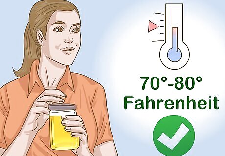 Select a room with a stable temperature. Raw honey is best stored between 70–80 °F (21–27 °C). Variations in temperature can cause honey to darken, lose flavor and lose nutritional value. Choose a storage location within the temperature range that is not prone to temperature changes. Kitchen cupboards, wardrobes and basements are good storage options. Make sure that the honey is kept away from appliances that produce heat. Keep in mind that the longer your honey sits on the shelf, the more it will crystallize.